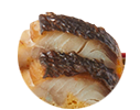 下味を付けたイサギに、人参、木耳入りの卵生地を包んで蒸し、香ばしく醤油だれで焼き上げた一品。