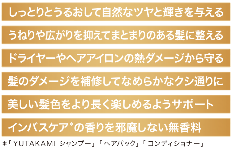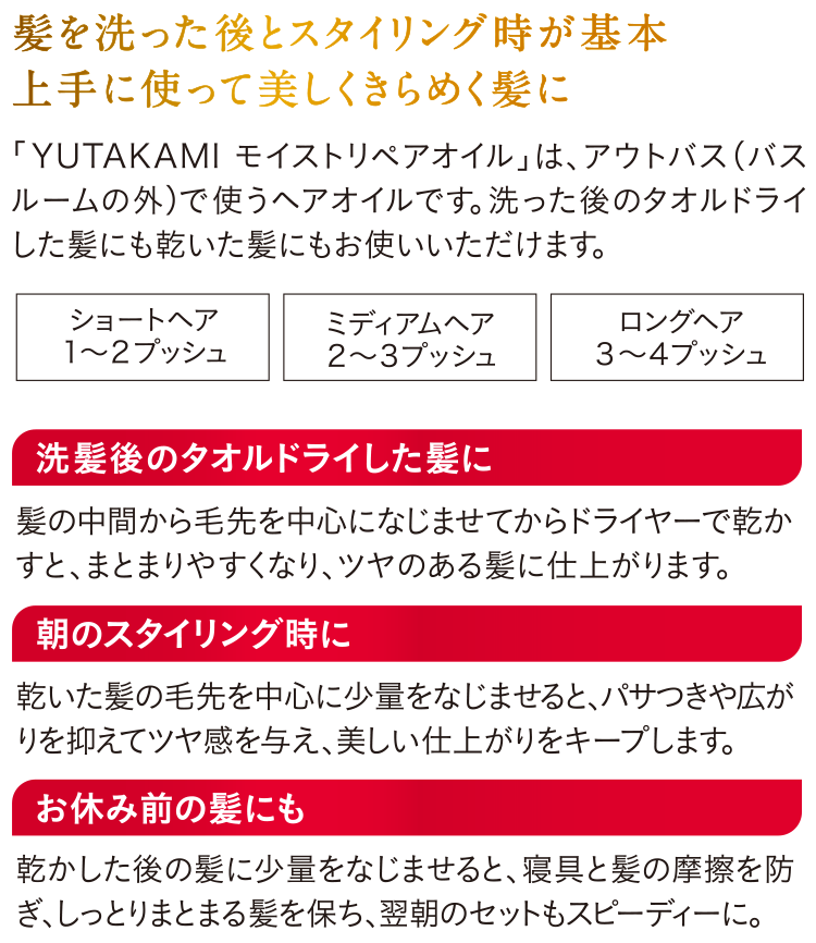 「YUTAKAMI モイストリペアオイル」は、アウトバス(バスルームの外)でお使いいただく髪専用のオイルです。ドライヤーによる熱や乾燥、紫外線、パーマなどでダメージを受け続ける大人の髪には、洗った後やスタイリング時にも丁寧にケアを重ねることが大切という考えから生まれました。