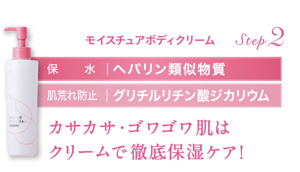 顔よりも皮脂腺が少ないボディの肌。歳を重ねるとともに皮脂やセラミドが減り、ますます乾燥しやすくなります。ガサガサやごわつきを防ぐには、上質な保湿ケアを欠かさず続けることがとても大切。肌荒れを予防する「モイスチュアボディクリーム」には、2つの薬用有効成分※を配合。さらに、カプセルに閉じ込めた複数の保湿成分を角質層のすみずみに届けるデリバリーシステムを採用しました。