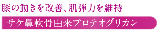 本品にはサケ鼻軟骨由来プロテオグリカンが含まれます。サケ鼻軟骨由来プロテオグリカンには肌弾力を維持し、肌の健康に役立つ機能、また、膝関節の不快感を持つ方の軟骨成分の分解を抑え、関節軟骨の保護に役立ち、膝関節の可動性、日常生活における膝の動き(階段の上り下り、歩く、立ち上がる、落ちたものを拾う、座っている)の改善に役立ち、起床時の膝の違和感を軽減する機能が報告されています。食生活は、主食、主菜、副菜を基本に、食事のバランスを。本品は、疾病の診断、治療、予防を目的としたものではありません。本品は国の許可を受けたものではありません。