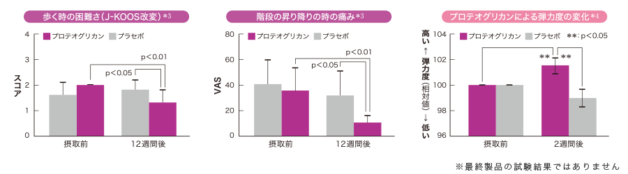 ※1 膝関節の不快感 ※2 肌の弾力 ※3 膝関節に不快感を有する健康な40~60代の男女31名に、サケ鼻軟骨由来プロテオグリカン10mg /日を12週間経口摂取し、二重盲検並行群間比較を行った結果 ※4 健康な20~50代の男女19名に、サケ鼻軟骨由来プロテオグリカン5mg/日を2週間経口摂取し、二重盲検並行群間比較を行った結果