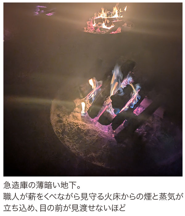 その主役を担うのが、国産のナラ材。急造庫と呼ばれる建物の地下で、細い薪や束ねた薪などを使い分けながら焚いていきます。薄暗い空間には火床から立ち上る煙に加え、薪とかつおの水分も充満し、目が開けられないほど。大量の薪を運ぶ火床での作業は、危険も伴う力仕事です。